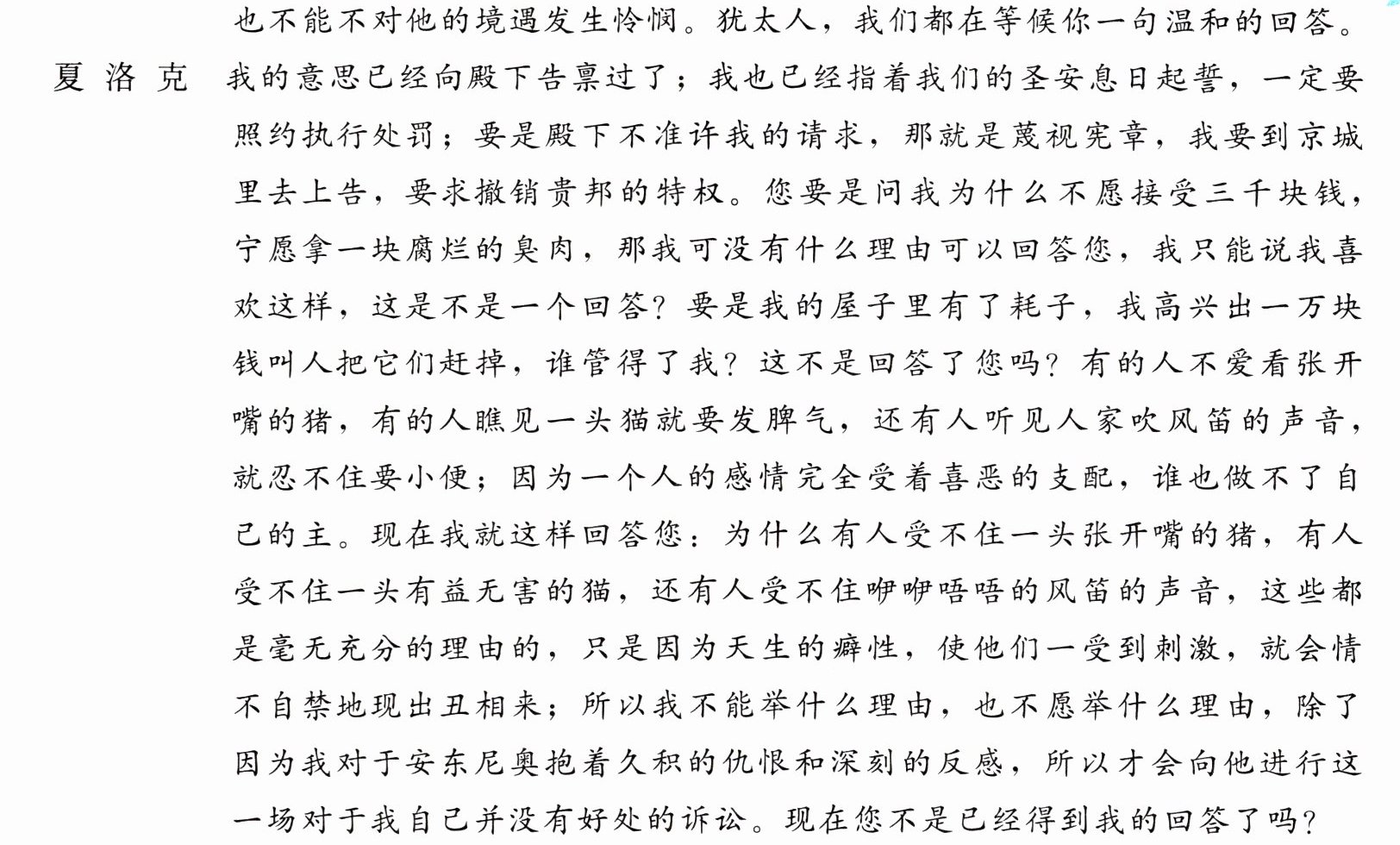 夏洛克 即使这六千块钱中间的每一块钱都可以分做六份,每一份都可以变成一块钱,我也不要它们;我只要照约处罚。