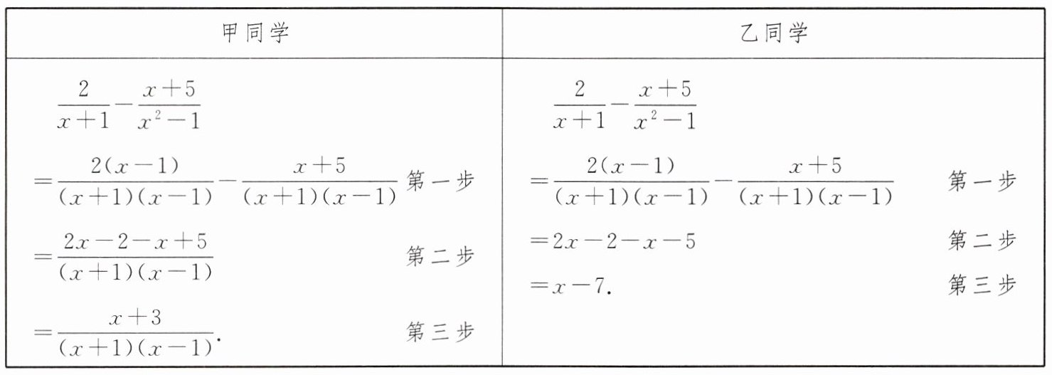 9. 数学老师在批改学生作业“计算:$\frac{2}{x + 1}-\frac{x + 5}{x^{2}-1}$”时,甲、乙两名同学完成的过程分别如下:
