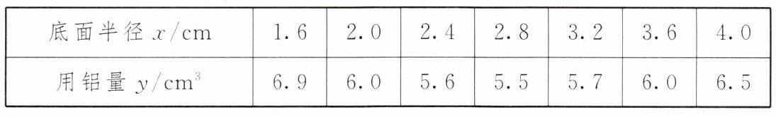 4. 某易拉罐厂正在设计一种易拉罐,在设计过程中发现符合要求的易拉罐的底面半径$x$(cm)与用铝量$y$($cm^{3}$)有如下关系: