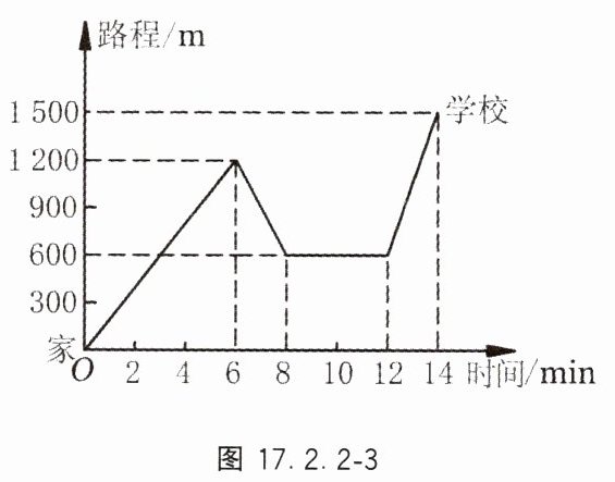 6. 小明骑单车上学,当他骑了一段路时,想起要买某本书,于是又折回到刚刚经过的书店,买到书后继续赶去学校上学. 图 17.2.2 - 3 表示的是他本次上学所用的时间与路程的关系示意图,请根据图中提供的信息回答下列问题: