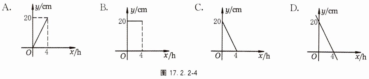 7. 一支蜡烛长 20 cm,若点燃后每小时燃烧 5 cm,则燃烧剩余的长度 y(cm)与燃烧时间 x(h)之间的函数关系的大致图象为图 17.2.2 - 4 中的( ).