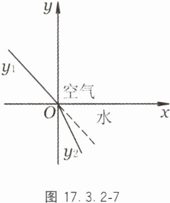 10. 图17.3.2 - 7表示光从空气进入水中前、后的光路图,若按如图所示建立平面直角坐标系,并设入水前与入水后光线所在直线的表达式分别为$y_1 = k_1x$,$y_2 = k_2x$,则下列关于$k_1$与$k_2$的关系正确的是( ).