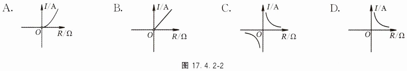 3. 已知蓄电池的电压$U$为定值,使用蓄电池时,电流$I$(单位:A)与电阻$R$(单位:$\Omega$)是反比例函数关系$(I = \frac{U}{R})$. 下列反映电流$I$与电阻$R$之间函数关系的大致图象是图17.4.2 - 2中的( ).