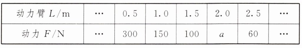 请根据表中数据规律探求,当动力臂$L$的长度为2.0 m时,所需的动力是( ).