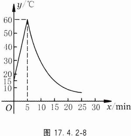 12. 制作一种产品,需先将材料加热达到$60^{\circ}C$后,再进行操作. 设该材料温度为$y$($^{\circ}C$),从加热开始计算的时间为$x$(min). 据了解:该材料加热过程中,温度$y$与时间$x$成一次函数关系;停止加热进行操作过程中,温度$y$与时间$x$成反比例关系,如图17.4.2 - 8所示. 测得该材料在操作加工前的温度为$15^{\circ}C$,加热$5$ min后温度达到$60^{\circ}C$.