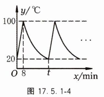 8. 小明家饮水机中原有水的温度为$20\ ^{\circ}C$,通电开机后,饮水机自动开始加热 [此过程中水温$y$($^{\circ}C$)与开机时间$x$(min)满足一次函数关系];当加热到$100\ ^{\circ}C$时自动停止加热,随后水温开始下降 [此过程中水温$y$($^{\circ}C$)与开机时间$x$(min)成反比例关系];当水温降至$20\ ^{\circ}C$时,饮水机又自动开始加热;…;重复上述程序. 根据图中(如图 17.5.1 - 4)提供的信息,解答下列问题: