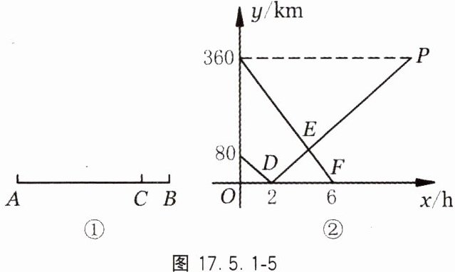 9. 如图 17.5.1 - 5①,在$A$、$B$两地之间有汽车站$C$站,客车由$A$地驶往$C$站,货车由$B$地驶往$A$地. 两车同时出发,匀速行驶. 图 17.5.1 - 5②是客、货两车离$C$站的路程$y_1$、$y_2$(km)与行驶时间$x$(h)之间的函数关系图象.
