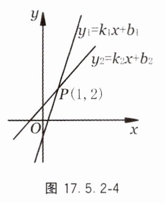 4. 如图 17.5.2 - 4,已知直线$y_1 = k_1x + b_1$,$y_2 = k_2x + b_2$的交点坐标为$P(1,2)$,则当$x$______时,$y_1>y_2$;当$x$______时,$y_1 = y_2$;当$x$______时,$y_1 < y_2$.