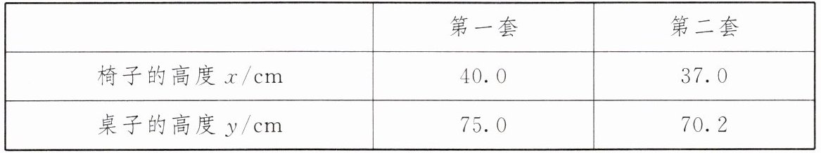 4. 为了保护学生的视力,课桌椅的高度是按一定关系配套设计的. 假设课桌的高度为$y\ cm$,椅子的高度为$x\ cm$,且$y$是$x$的一次函数,下表给出两套符合条件的课桌椅的高度:
