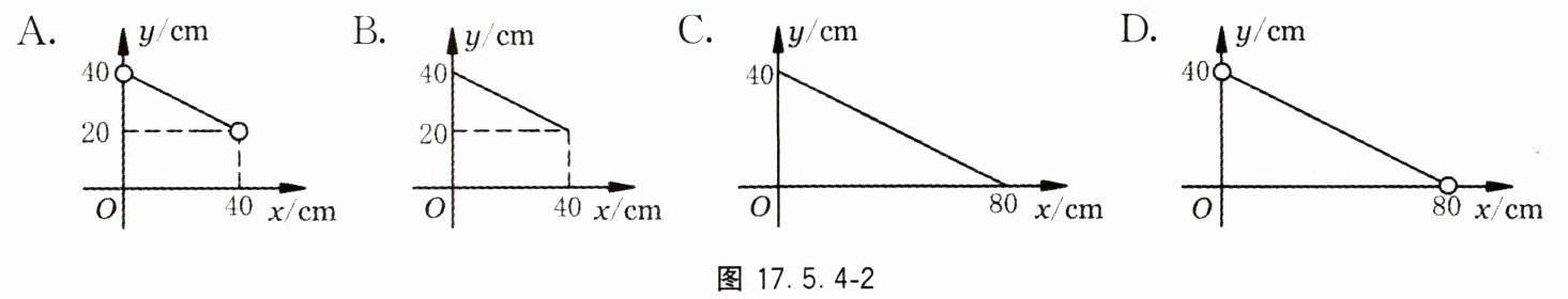 4. 若等腰三角形的周长是80 cm,则在图17.5.4 - 2中,能反映这个等腰三角形的腰长$y$与底边长$x$的函数表达式的图象是( ).