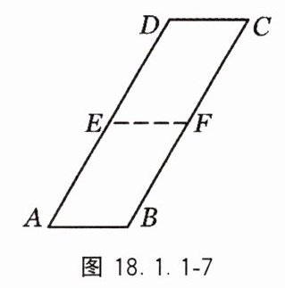 9. 如图18.1.1-7,在平行四边形纸条ABCD中,E、F分别是边AD、BC的中点,张老师请同学们将纸条的下半部分□ABFE沿EF翻折,得到一个V字形图案.
