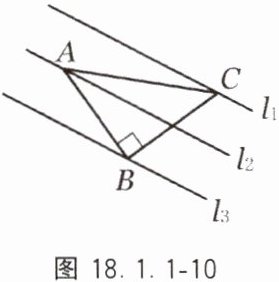 13. 如图18.1.1-10,在△ABC中,∠ABC=90°,AB=BC,三角形的顶点分别在相互平行的三条直线l1、l2、l3上,且相邻两平行线之间的距离均为1,求AC的长.