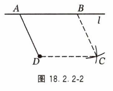 2. 如图18.2.2-2,点D是直线l外一点,在l上取两点A、B,连结AD,分别以点B、D为圆心,AD、AB的长为半径画弧,两弧交于点C,连结CD、BC,则四边形ABCD是平行四边形,理由是:______________________________.
