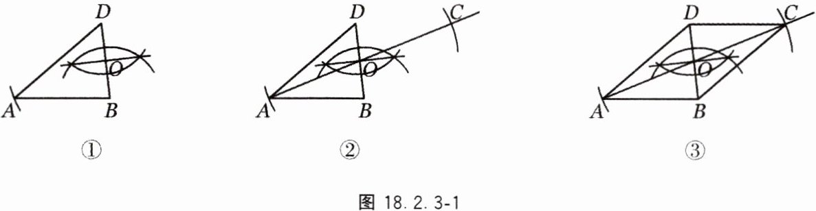 2. 综合实践课上,嘉嘉画出△ABD,利用尺规作图找一点C,使得四边形ABCD为平行四边形. 其作图过程如图18.2.3-1所示,依次是①作BD的垂直平分线交BD于点O;②连结AO,在AO的延长线上截取OC = AO;③连结DC、BC,则四边形ABCD即为所求.