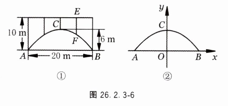 3. 如图 26.2.3 - 6①,一座拱桥的轮廓是抛物线形,拱高为$6\ m$,桥体高为$10\ m$,跨度$AB$长为$20\ m$,相邻两支柱间的距离均为$5\ m$.以$AB$所在的直线为$x$轴,以线段$AB$的垂直平分线$OC$所在的直线为$y$轴建立如图 26.2.3 - 6②所示的平面直角坐标系.