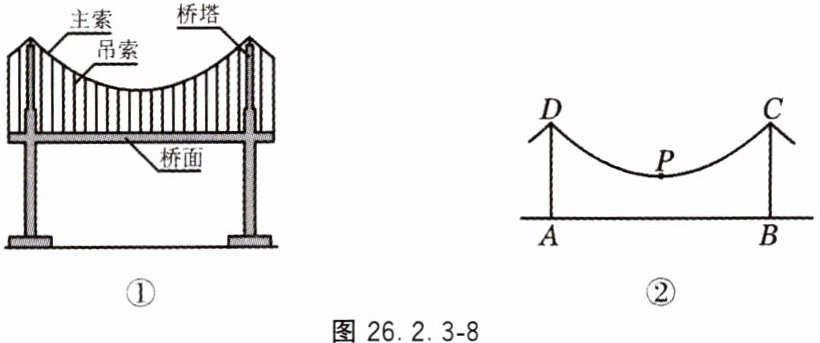 材料 2:如图 26.2.3 - 8②,某一同类型悬索桥,两桥塔$AD = BC = 10\ m$,间距$AB = 32\ m$,桥面$AB$水平,主索最低点为点$P$,点$P$距离桥面为$2\ m$.