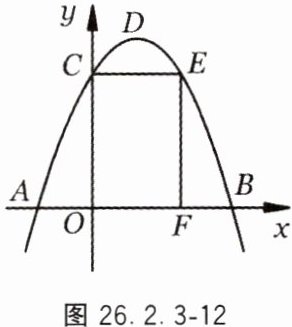 7. 如图 26.2.3 - 12,抛物线$y = -x^{2}+bx + c$与$x$轴交于$A$、$B$两点,与$y$轴交于点$C$,点$O$为坐标原点,点$D$为抛物线的顶点,点$E$在抛物线上,点$F$在$x$轴上,四边形$OCEF$为矩形,且$OF = 2$,$EF = 3$.