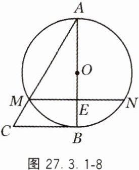 10. 如图 27.3.1 - 8,在$\triangle ABC$中,以 $AB$ 为直径的$\odot O$交 $AC$ 于点 $M$,弦 $MN// BC$交 $AB$ 于点 $E$,且 $ME = 1$,$AM = 2$,$AE = \sqrt{3}$.