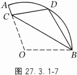 9. 如图 27.3.1 - 7,在扇形 $OAB$ 中,若$\angle AOB = 110^{\circ}$,$OA = 18$,将扇形 $OAB$ 沿过点 $B$ 的直线折叠,使点 $O$ 恰好落在$\overset{\frown}{AB}$上的点 $D$ 处,折痕交 $OA$ 于点 $C$,则$\overset{\frown}{AD}$的长为( ).
