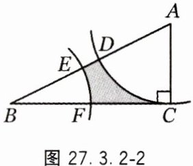 2. 如图 27.3.2 - 2,在 $Rt\triangle ABC$ 中,$\angle ACB = 90^{\circ}$,$AB = \sqrt{5}$,$BC = 2$,以点 $A$ 为圆心、$AC$ 为半径画弧,交 $AB$ 于点 $D$,交 $AC$ 于点 $C$. 以点 $B$ 为圆心、$AC$ 为半径画弧,交 $AB$ 于点 $E$,交 $BC$ 于点 $F$. 图中阴影部分的面积为( ).