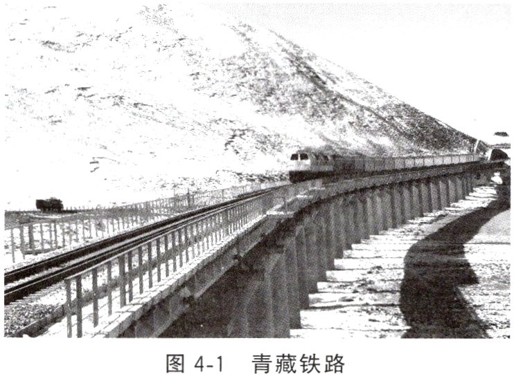 图4 - 1所示的是青藏铁路,简称青藏线。全长1956千米,其中西格段814千米,20世纪50年代起准备建设,1979年铺轨,1984年运营;格拉段1142千米因存在千里冻土、高寒缺氧、生态脆弱三大世界级难题而长期停建,最终于2001年开工,2006年运营。到2016年历时七年的青藏铁路无缝钢轨换铺工程完成,实现了“千里青藏一根轨”。青藏铁路被誉为“天路”,是世界上海拔最高、在冻土上路程最长的高原铁路,2013年入选“全球百年工程”。