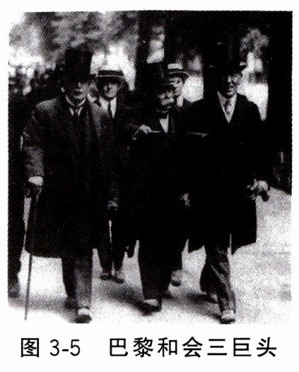 图3 - 5所示的是巴黎和会三巨头。参加巴黎和会的各国代表有1 000多人,其中全权代表70人。后改为“四人会议”,即美国总统威尔逊(前排居右)、英国首相劳合·乔治(前排居左)、法国总理克里孟梭(前排居中)和意大利首相奥兰多。因意大利实力相对弱,被英、法、美冷落一边,所以实际上又变为“三人会议”。巴黎和会的三巨头为了各自的利益,经过无数次的争执和讨价还价,最终达成妥协。