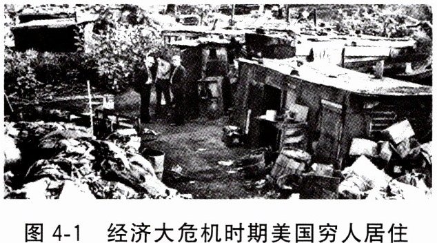 【教材图释】 随着经济大危机的爆发,美国经济恶化,出现大量失业者。美国许多家庭失去了住房,靠政府救济。美国社会从繁荣的高峰跌入危机的谷底。人们用“胡佛村”来讽刺胡佛政府面对经济危机的举措。