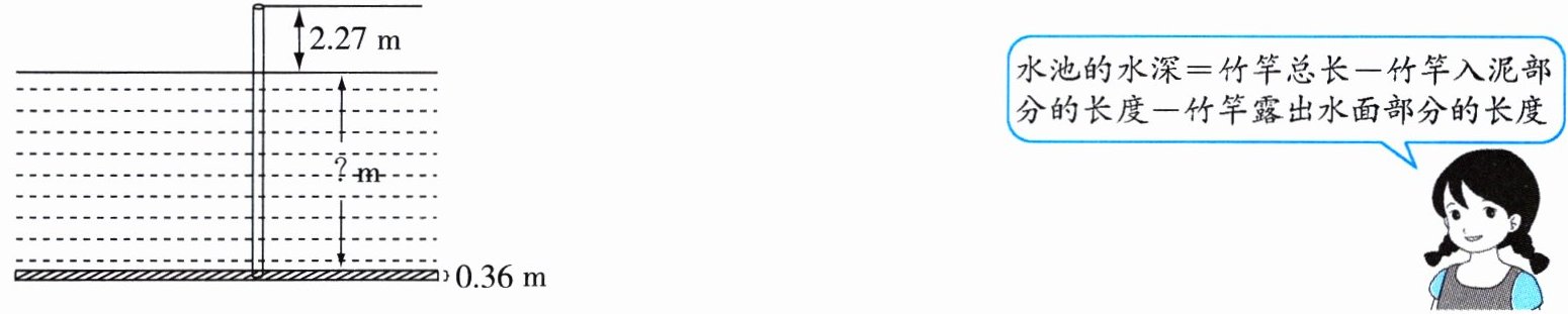 3. 如图所示,把长为 10 m 的竹竿竖直插入水池中,竹竿入泥的部分是 0.36 m,露出水面的部分是 2.27 m,水池的水深是多少米?
