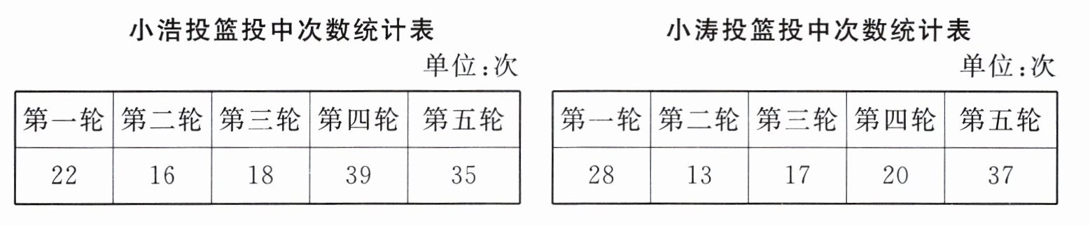 2. 小浩和小涛进行五轮投篮比赛,他们每轮投篮 50 次,投中次数的统计表如下表所示。比一比,谁投得准?