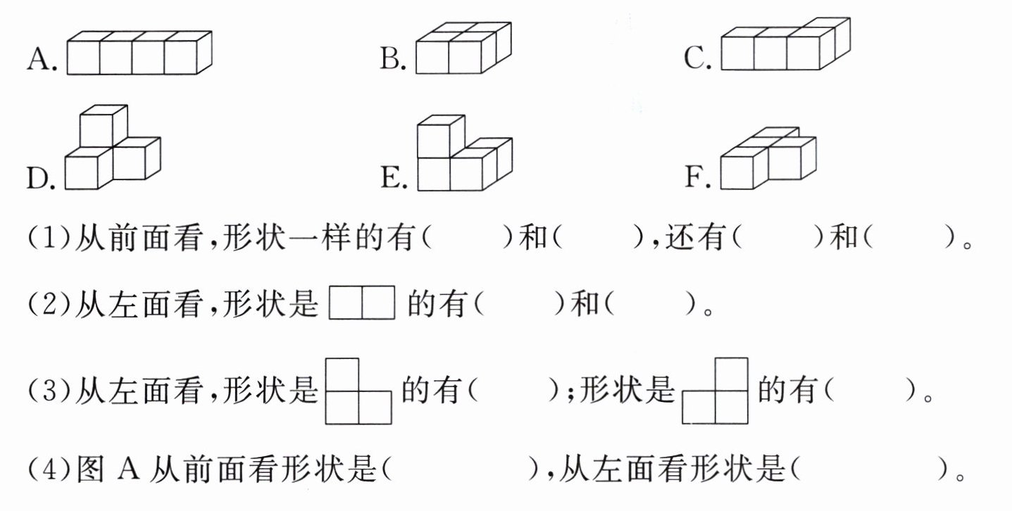 4. 活动课上,小明用4个小正方体搭成了以下几种不同的物体。