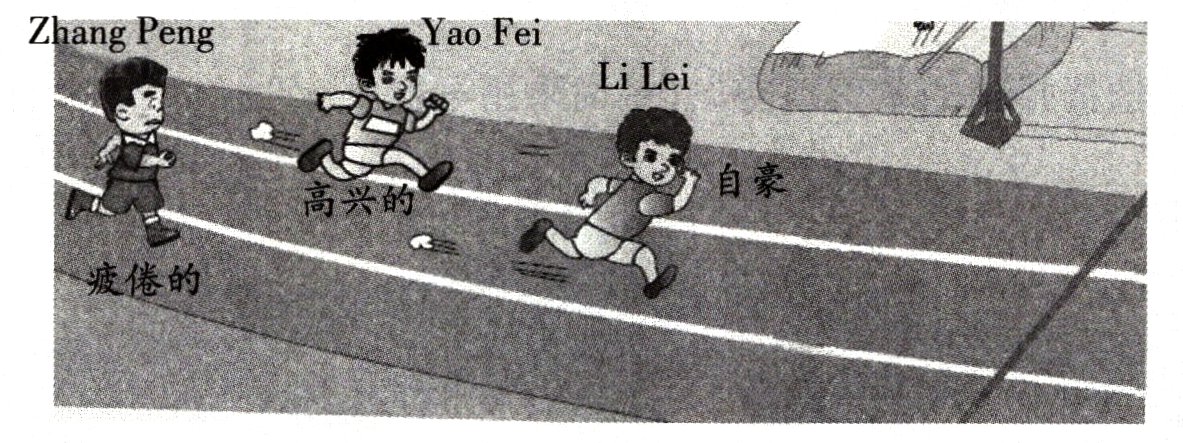 It is Sports Day. Wei Jun is running 100 - meter race. He is running very fast. He is the first. We are very proud of him. Liang Yi is doing long jump. He is trying to do well. He is the second. He is happy. Hao Yang is swimming. She is not good at it. She looks tired. She is the third. Tian Tian is doing high jump. She is falling down. She is the fourth. She is sad.