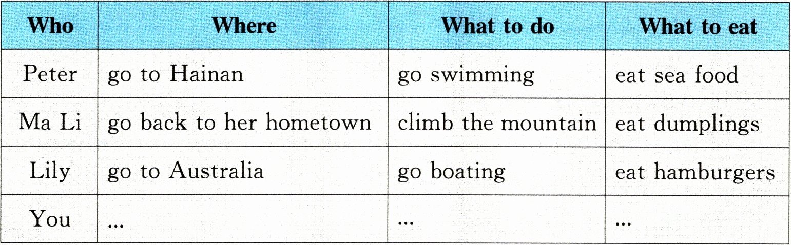例:In winter vacation, Peter went to Hainan. He went swimming with his parents. He ate sea food.