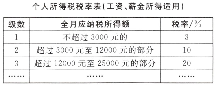 2018年10月1日起,我国实施新的个人所得税征收标准:月收入5000元及以下不纳税;月收入超过5000元,超过部分按下表的标准征税。