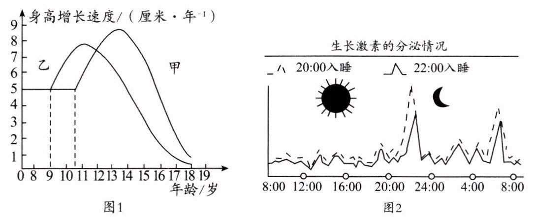 (2)__________是青春期的一个显著特点。图 1 的曲线甲表示_____(填“男”或“女”)孩身高增长速度的变化。由图中曲线可以看出,男孩身高突增比女孩身高突增的时间_____(填“早”或“晚”)。随着年龄的增长,男孩和女孩的身高增长速度都_______。