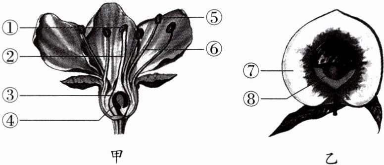 7. (2022·宿迁)“桃花春色暖先开,明媚谁人不看来。”诗句描述了春天桃花盛开的美丽景色。桃子果肉鲜嫩,汁多味美,深受人们喜爱。下图是桃花和桃的果实结构示意图,据图回答问题。