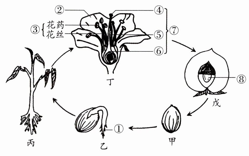 (3)植株生长到一定时期就会开花,花的主要结构是[⑦]和[ ]。开花、传粉后,图丁胚珠里面的____,与来自花粉管中的精子结合形成受精卵,这个过程叫作受精。
