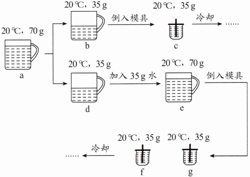 - (4)取少量配好的饱和溶液品尝后,小宁认为溶液过甜,小雨仍坚持做最甜的冰棍。于是,二人倒出70 g溶液,按如图所示方案(部分流程省略)分别制作冰棍。