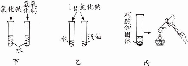 - (3)实验丙:加热后的现象是__________________________,说明同种溶质在同一溶剂中的溶解性与_______有关。