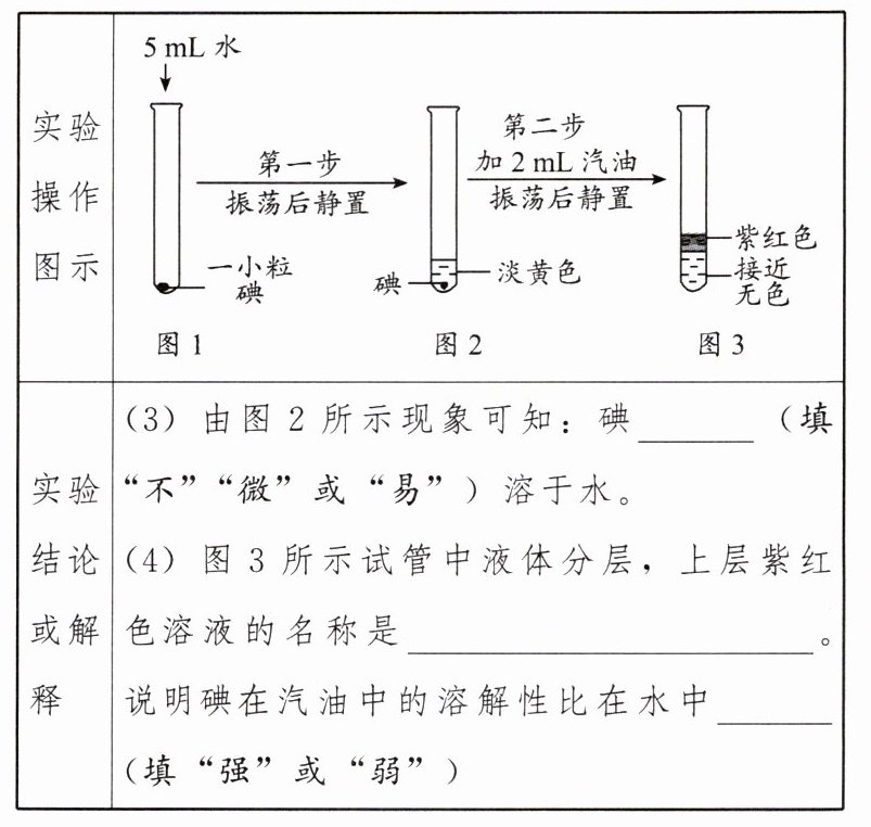 (1)紫红 (2)液体分层,上层为无色,下层为紫红色,试管底部无固体残留 (3)微 (4)碘的汽油溶液 强 (5)①不分层 ②与水不互溶,碘在这种液体中的溶解性远大于在水中的溶解性