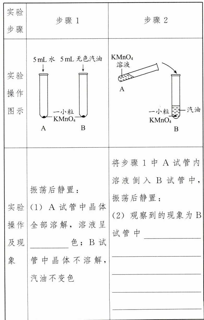 10. 为了探究相同条件下同种溶质在不同溶剂中的溶解性,某兴趣小组同学进行如下两组实验。(提示:本实验所用汽油与$KMnO_4$、碘均不发生化学反应)