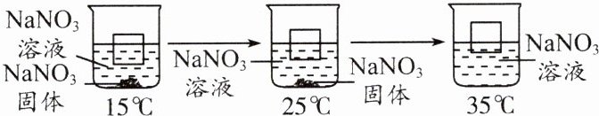 D(提示:实验过程中溶质质量增大,溶剂质量不变。由图可知,木块在烧杯中排开液体的体积不同,说明实验过程中NaNO₃溶液的密度不一样,故A项错误;由图可知,35℃时烧杯中没有未溶解的固体,可能是饱和溶液,也可能是不饱和溶液,故B项错误;实验过程中温度升高,等质量的溶剂中溶解的NaNO₃的质量增大,说明NaNO₃的溶解度随温度的升高而增大,故C项错误;实验过程中溶剂质量不变,15℃时溶质的质量最小,则15℃时所得溶液的溶质质量分数最小,故D项正确)