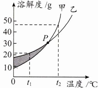A(提示:A项,由图可知,P点时,甲、乙两种物质的溶解度相等,P点表示两种溶液的饱和状态,则P点时甲、乙两种溶液的溶质质量分数相等;B项,图中阴影部分的点在甲曲线的上方,表示甲的饱和溶液,在乙曲线的下方,表示乙的不饱和溶液;C项,甲、乙的溶解度都随温度的升高而增大,t₁℃时,乙的溶解度大于甲的溶解度,此时饱和溶液的溶质质量分数为乙>甲,升温至t₂℃后,溶液都变成不饱和溶液,溶液组成不变,溶质质量分数不变,即升温后溶液的溶质质量分数为乙>甲;D项,t₂℃时,在100 g水中加入60 g甲,可得到饱和溶液。故选A)