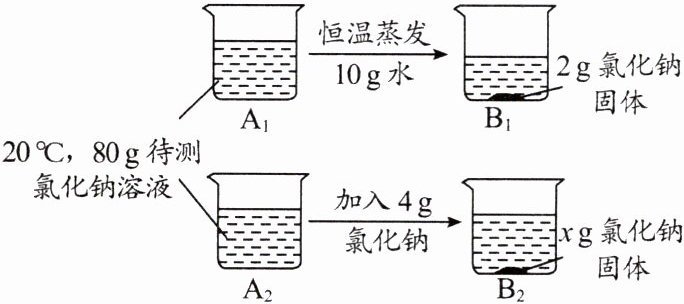 [提示:(2)20 °C 时,氯化钠的溶解度为 36 g。若$A_{1}$是饱和溶液,则蒸发的 10 g 水与析出的氯化钠固体会形成饱和溶液,析出的氯化钠固体质量为 10 g×$\frac{36 g}{100 g}$ = 3.6 g,3.6 g>2 g,说明$A_{1}$中的溶液是不饱和溶液。溶液具有均一性,故$A_{2}$中的溶液也是不饱和溶液。(3)根据图示可知,$B_{1}$、$B_{2}$中的溶液都是饱和溶液,相同温度下溶质与溶剂的质量比相等。(4)$B_{1}$溶液的质量为 80 g - 10 g - 2 g = 68 g,则该饱和溶液中氯化钠的质量为 68 g×$\frac{36 g}{100 g + 36 g}$ = 18 g,水的质量为 68 g - 18 g = 50 g,则$A_{1}$溶液中水的质量为 50 g + 10 g = 60 g,氯化钠固体质量为 18 g + 2 g = 20 g。溶液具有均一性,$A_{1}$与$A_{2}$中溶液的溶质、溶剂质量相等。20 °C 时,60 g 水最多溶解氯化钠的质量为 60 g×$\frac{36 g}{100 g}$ = 21.6 g,20 g + 4 g - 21.6 g = 2.4 g,故 x 的值为 2.4。(5)根据第(4)小题分析可知,待测氯化钠溶液的溶质质量分数为$\frac{20 g}{20 g + 60 g}$×100% = 25%]