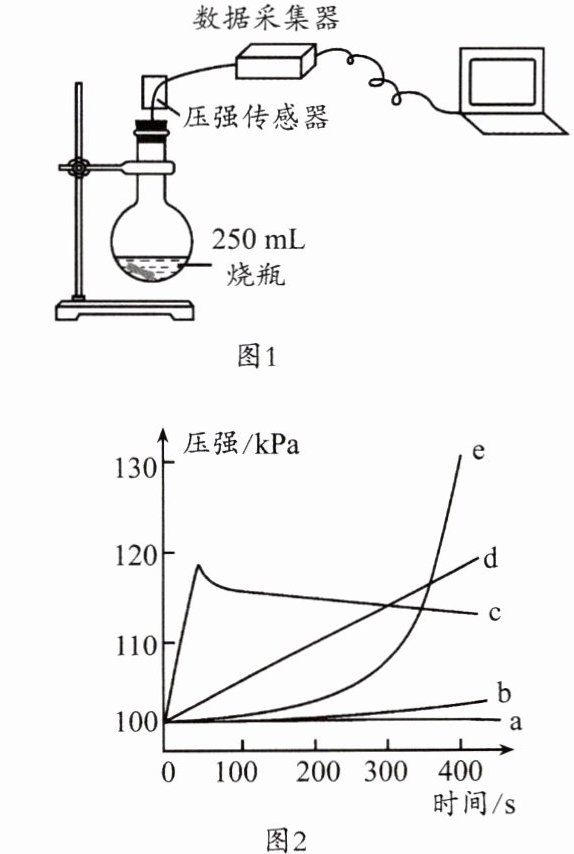 6. 兴趣小组的同学运用手持技术探究铝等金属与酸的反应。如图 1,向 250 mL 的烧瓶内注入 25 mL 溶质质量分数为 8.8%的稀盐酸,剪取长约 4 cm、宽约 0.4 cm 的镁、铝、锌、铜、铁金属条,打磨后分别投入烧瓶中,迅速塞紧带有压强传感器的橡皮塞,采集得到如图 2 所示的压强变化曲线。回答下列问题: