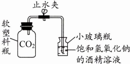 4. 已知:20 ℃时,氢氧化钠易溶于酒精,碳酸钠在酒精中几乎不溶解。20 ℃时,某同学利用如图所示微型实验验证 CO₂能与 NaOH 发生反应。打开止水夹,轻轻挤压软塑料瓶,观察实验现象。下列说法不正确的是( )。