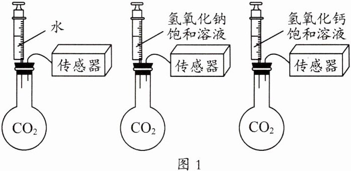 9. 某实验小组利用图 1 所示装置进行实验,探究 CO₂的性质:分别向三个烧瓶中注入等体积的水、氢氧化钠饱和溶液、氢氧化钙饱和溶液。利用数字化实验装置分别测定烧瓶内的压强变化,得到的曲线如图 2 所示。
