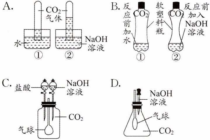 8. 合理的实验设计往往可以让我们得出准确的结论。下图所示实验设计不能证明 CO₂的确与 NaOH 溶液发生了化学反应的是( )。