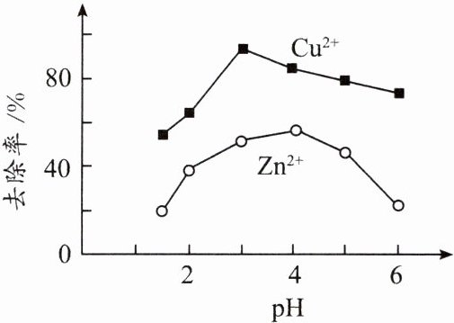 7. 湿法炼铜产生酸性废水,其中含有的 CuSO₄、ZnSO₄可用铁炭混合物(铁粉和活性炭的混合物)除去。已知:其他条件不变,废水 pH 对 Cu²⁺、Zn²⁺去除率的影响如图所示。下列说法正确的是( )。