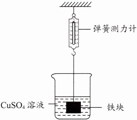 9. 通常情况下,相同体积的溶液中溶质质量越大,溶液密度越大。如图所示,将悬挂在弹簧测力计上的铁块浸没在 CuSO₄溶液中,一段时间后,弹簧测力计的示数变大,溶液体积变化忽略不计。下列有关表述错误的是( )。