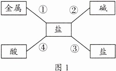 10. 某同学学习盐的性质后,利用图 1 所示的思维导图归纳了盐的四项化学性质。请选择 HCl、CuSO₄、Ca(OH)₂、Na₂SO₄、CaCl₂、Na₂CO₃、CaCO₃、Fe 等物质完成填空。